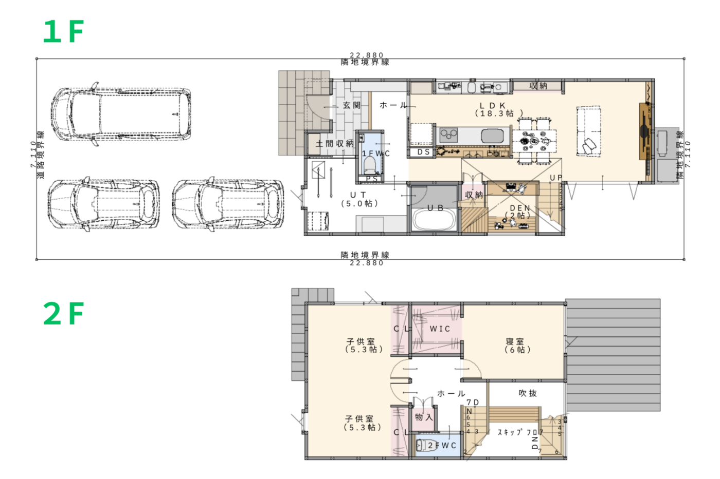 | 3LDK | 敷地面積:162.67㎡(49.20坪) 建築面積:68.11㎡(20.60坪) 1階床面積:64.59㎡(19.53坪) 2階床面積:55.27㎡(16.71坪) ※吹抜含む 延床面積 : 119.86㎡(36.24坪) ポーチ:2.89㎡(0.87坪) 施工面積:122.75㎡(37.11坪) |